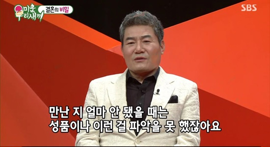 단골 식당 사장이 아내의 친구였다. 그래서 미팅이 됐다. 그때가 11년 전이다"라며 아내와 결혼 비하인드 스토리도 털어놓았다. "이 친구가 조그마한 별장도 있고 사업도 하다가 이제는 뒷전으로 물러나 행복하게 살려고 하는 친구다"라고 소개를 받았는데 "별장이 있다는 말에 귀가 솔깃했다. 별장을 가지고 있을 정도면 생활비를 꼬박꼬박 안 가져다줘도 되겠다라고 생각했다"라고 솔직하게 그 시절을 떠올렸다.