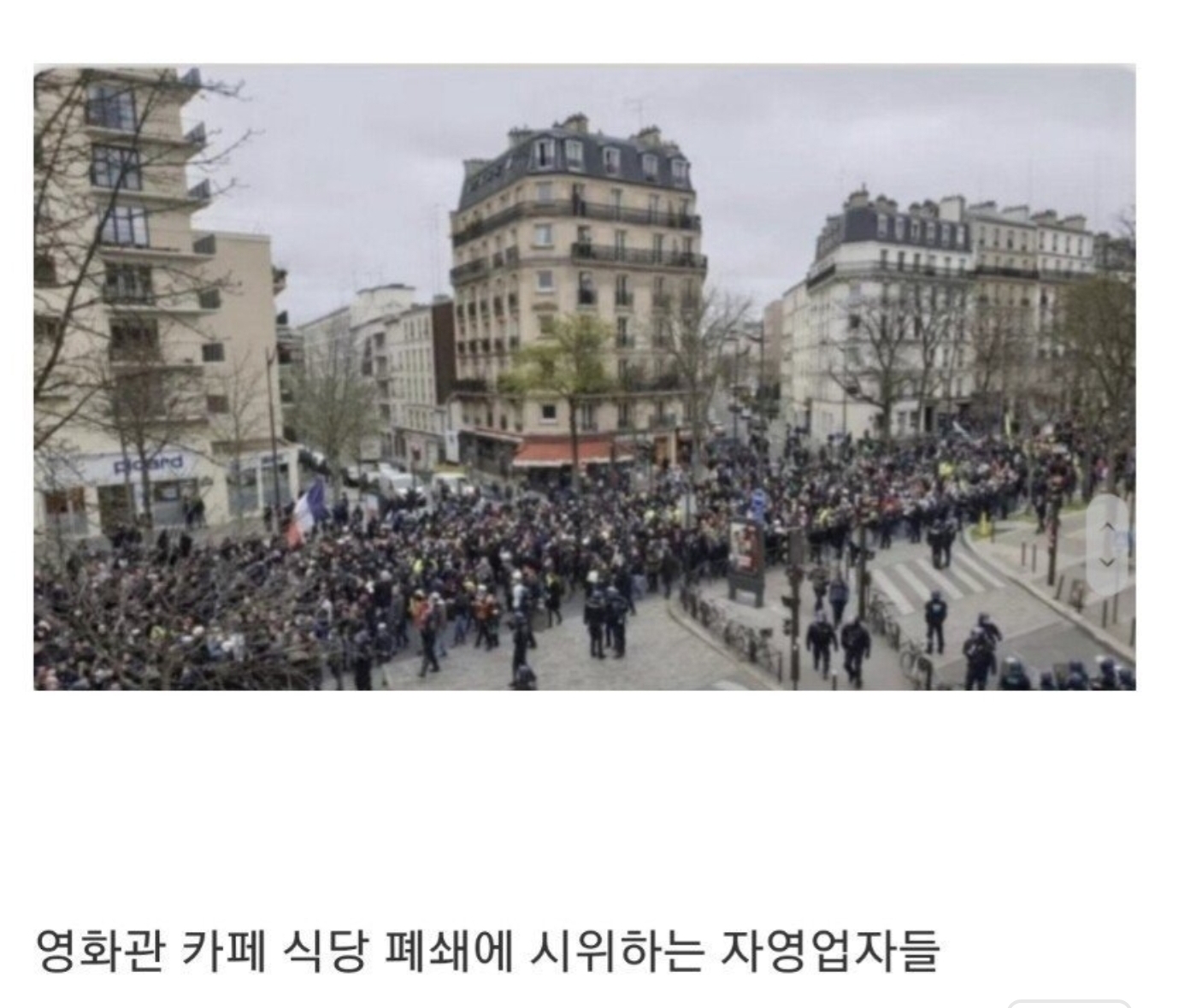 이런 프랑스 사람들이 많으니 약국을 제외한 모든 곳을 폐쇄했다.하지만 그 폐쇄를 반대하는 사람들이 많다. 여기서도 마스크를 안 낀 사람들이 많다.
