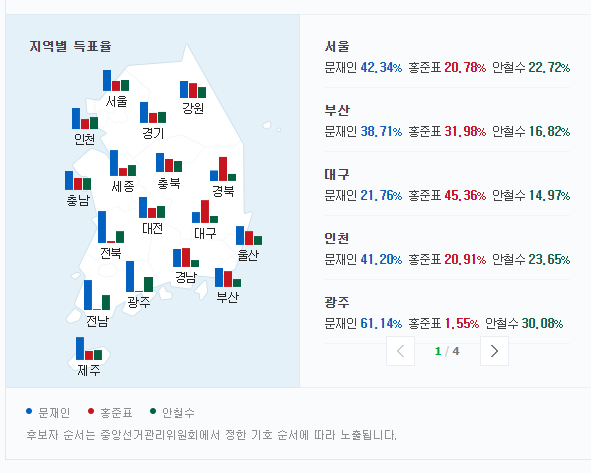 경북과 대구광역시를 제외하고는 압도적으로 문재인 대통령이 뽑혔다. 그나저나.. 전라남도하고 전라북도, 광주 쪽은 진짜..일편단심인 거 같다.