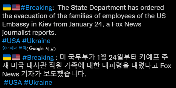 미국 정부가 우크라이나의 미국대사관 직원 가족에게 철수 명령을 내렸다고 AP통신과 로이터통신 등 외신이 23일(현지시간) 보도했었다.