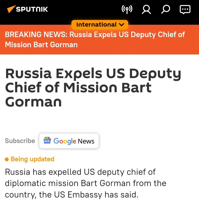러시아 국영언론인 스푸트니크에서 미국 대사관 바트 고르먼을 추방했다고 밝혔다.