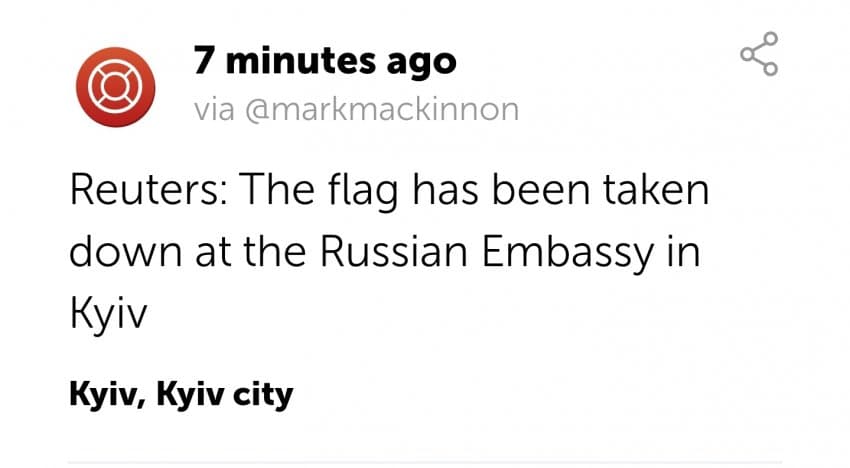 키예프에 있는 러시아 대사관에서 러시아 국기가 내려갔고. 모든 직원들이 철수했다고 함.