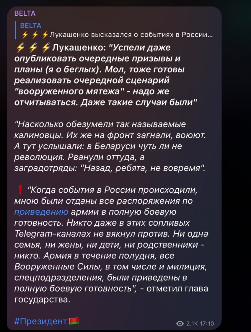 요약 : 루카센코가 러시아가 죽으면 우리도 죽는 것이라고 함. 그리고 벨라루스에 쿠데타 조짐이 보여 전투 준비 태세로 전환함.