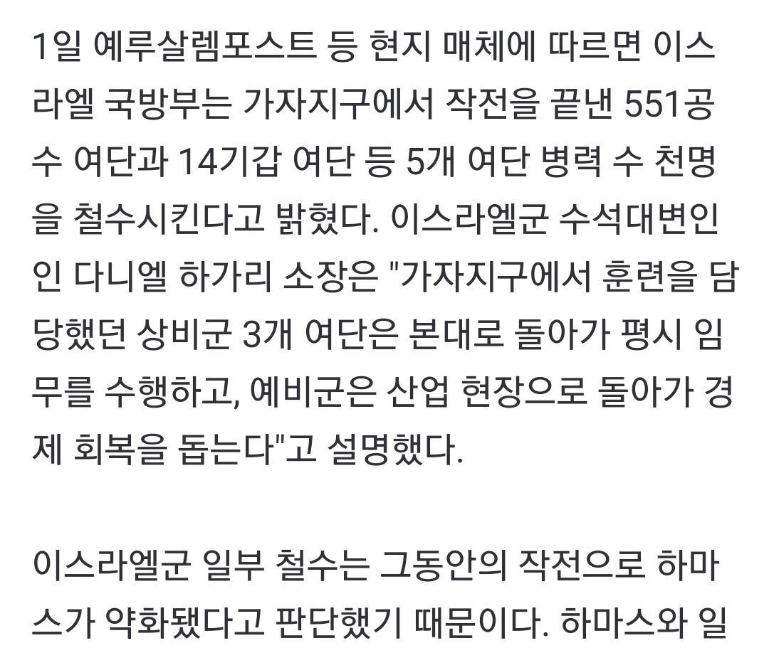 사실상 이스라엘 VS 하마스 전쟁은 이스라엘 승리로 끝이났다 보고 예비군을 산업 현장으로 다시 돌려 보내는 중에 있었는데...